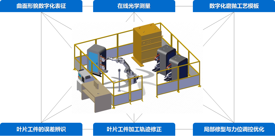 机械系王辉副教授团队针对航空发动机叶片曲面精密光整加工的技术需求,构建了航空发动机叶片智能磨抛单元的技术框架。通过表面宏微观几何形貌特征的分解及重构提出了零件关键工艺表面创成式精细化表征方法,解决了复杂型面的数字化形貌表征难题;以叶片工件的在线光学测量数据为输入,提出了工件位姿偏差、表面加工余量的辨识算法和基于工艺模板的工件加工轨迹修正方法,构建出叶片精密光整工艺的主体流程;并提出表面凸凹点法矢的动态辨识和恒力多道次加工参数自适应调控方法,为复杂曲面的局部修型与力学性能优化提供了手段。项目技术方案从工艺原理及智能控制方法两个方面入手,在改善叶片的加工误差与表面残余应力分布特性方面具有显著成效。