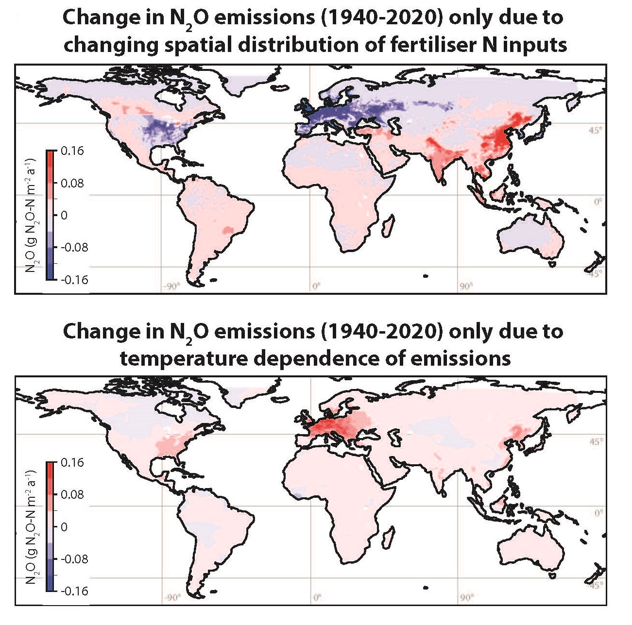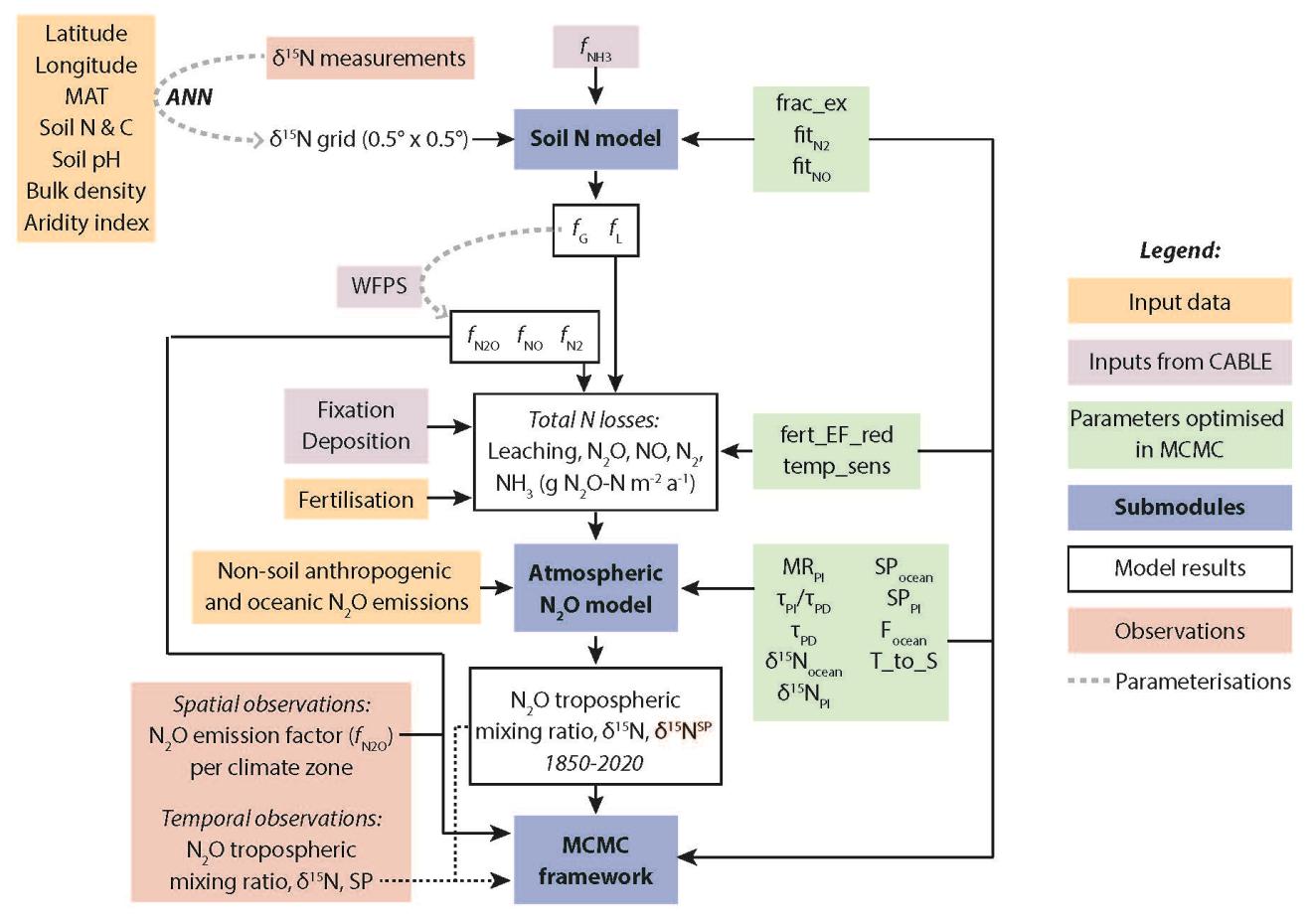结合上述问题,心博在线登录入口深圳国际研究生院余龙飞课题组与瑞士苏黎世联邦理工学院Eliza Harris课题组展开了密切合作,开发了一套土壤-大气氮同位素耦合过程模型(IsotopicTracingOfNitrogen in theEnvironment-IsoTONE),以评估全球尺度下N2O排放的时空分布规律。该模型以全球土壤δ15N丰度分布为基础,模拟土壤氮损失和N2O排放过程,并利用大气背景下N2O同位素的长期观测数据加以验证,来计算N2O排放系数的全球分布特征,以及在1940-2020年间的变化趋势。