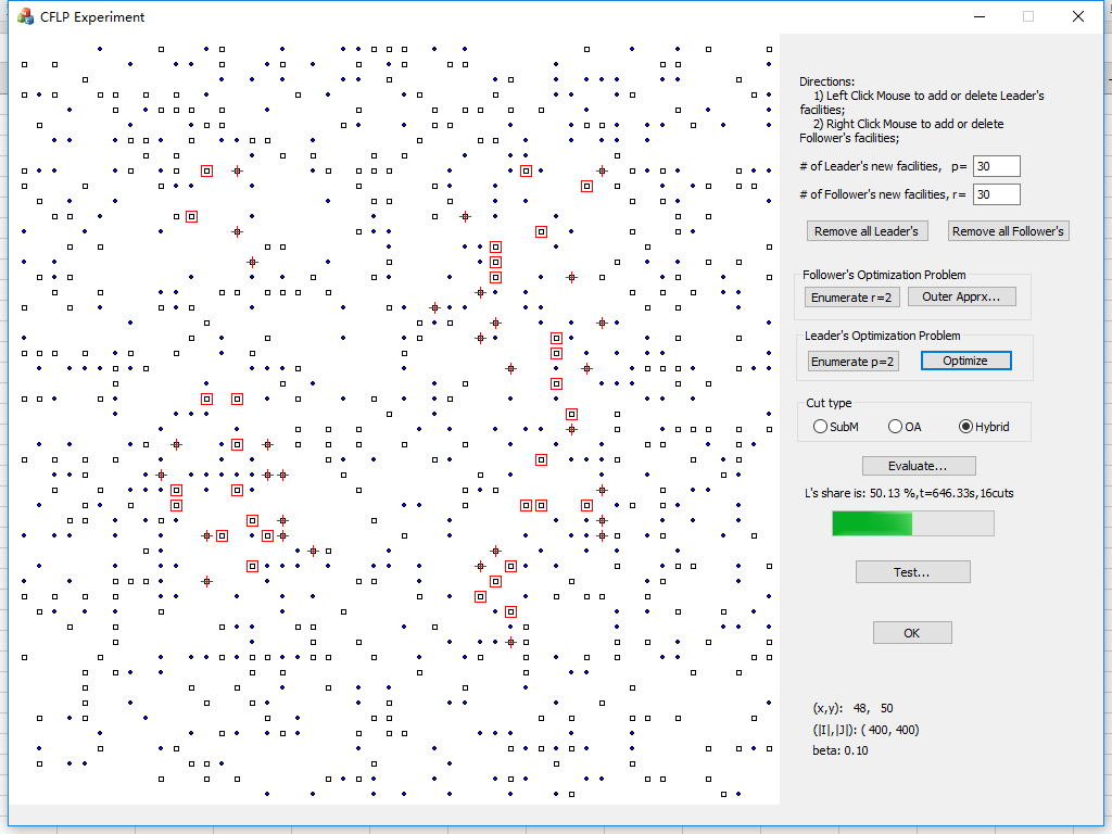 图1. 序贯竞争性设施选址问题求解界面(圆点为顾客点,黑色方框为候选设施点,红色方块为领导者所选的设施,红十字为跟随者选择的设施)