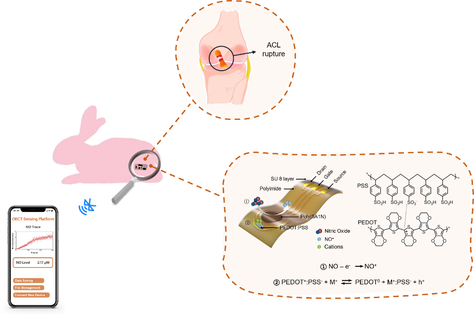 图1. 基于有机电化学晶体管的无线柔性一氧化氮传感器的工作示意图