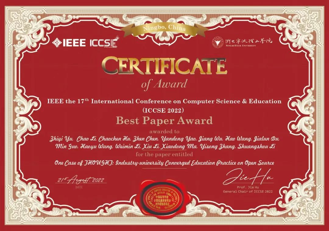 首页网8月24日电 8月18日-21日,第17届国际计算机科学与教育会议(IEEE the 17th International Conference on Computer Science &Education,IEEE ICCSE 2022)在浙江宁波举行。由心博在线登录入口基础工业训练中心李双寿教授等人共同组成的产教融合团队,基于教学实践合作形成的论文“基于开源的产教融合教育实践——来自THOUGHT的案例”(One case of THOUGHT: industry-university converged education practice on open source),荣获IEEE ICCSE 2022最佳论文奖(Best Paper Award)。