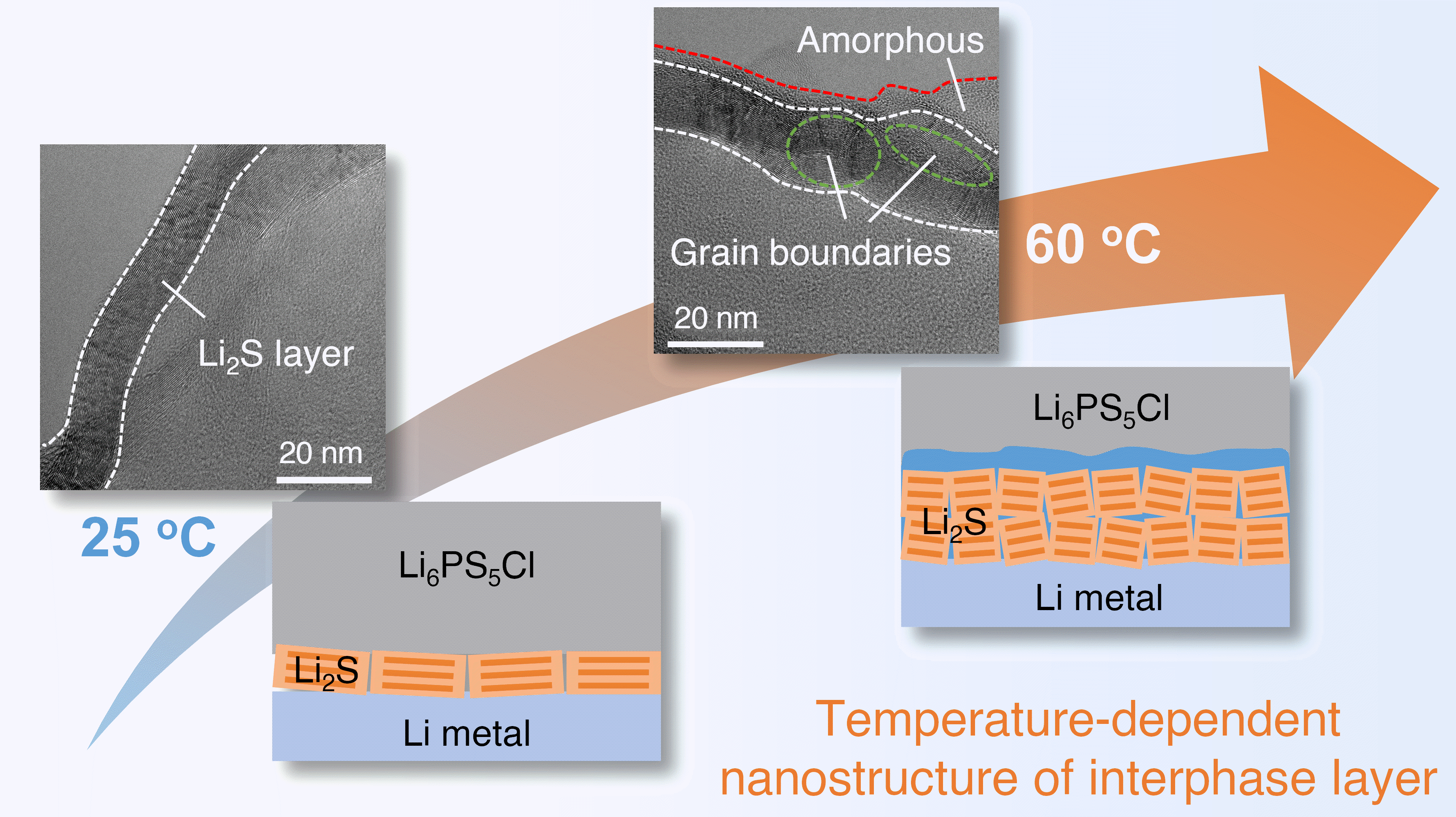 图3.不同温度下单根锂枝晶和硫化物电解质形成的界面层纳米结构及演化示意图