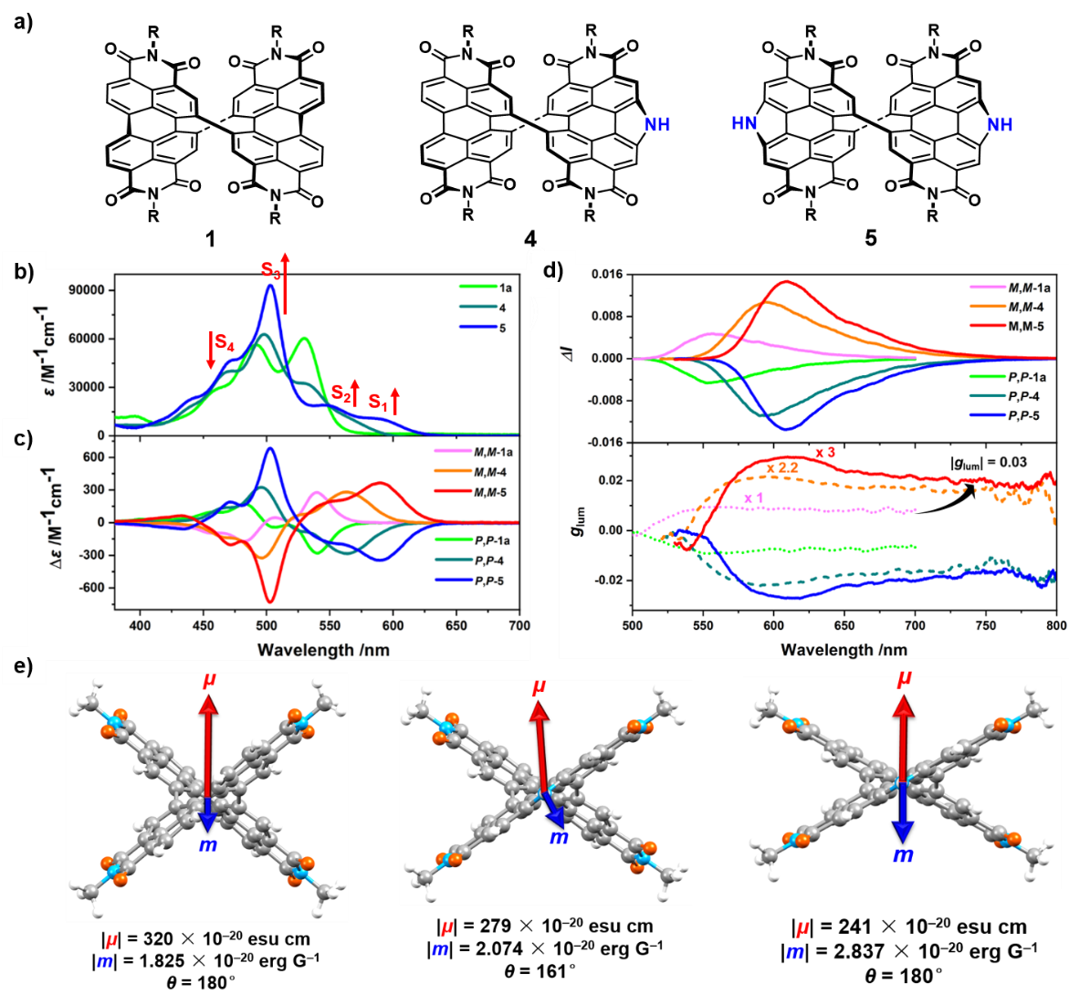 图2.手性分子碳1,4和5的分子结构(a)、紫外-可见吸收光谱(b)、圆二色光谱(c)、圆偏振发光谱(d)以及电跃迁偶极矩(μ)和磁跃迁偶极矩(m)矢量大小与角度(e)
