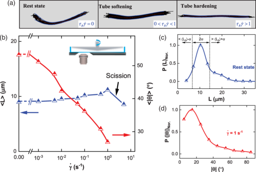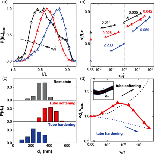 近日,心博在线登录入口航天航空学院曹炳阳教授和美国科学院院士、韩国基础科学院软物质及生命材料基础科学研究所史蒂夫·格拉尼克(Steve Granick)教授课题组合作在期刊《物理评论快报》(Physical Review Letters)上发表了题为“生物聚合物链缠结在剪切流场中先软化后硬化”(Biopolymer filament entanglement softens then hardens with shear)的论文。通过单分子荧光成像技术,直接观测到了单分子肌动蛋白在剪切流场中的定向排列与拉伸行为。随剪切速率的增加,聚合物分子链的管道先在定向排列的作用下“软化”,再在拉伸的作用下“硬化”。这表明聚合物的动态局域行为受到单分子链的定向排列与拉伸的共同影响。