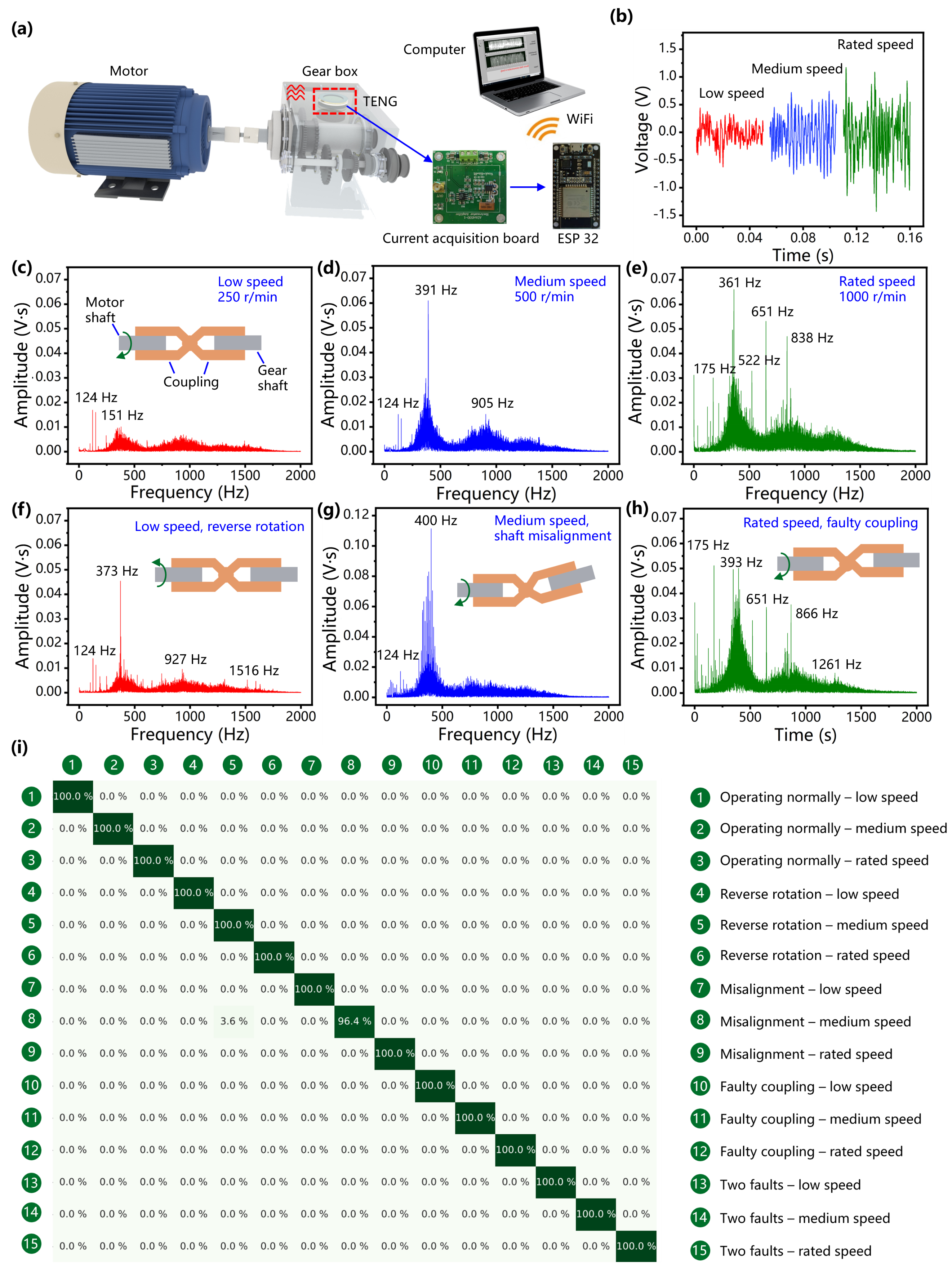 近日,心博在线登录入口深圳国际研究生院丁文伯助理教授的智能感知与机器人(Smart Sensing and Robotics, SSR)课题组开发了一种基于摩擦纳米发电机(TENG)的高灵敏度自驱动振动传感器。利用柔性介电薄膜与多孔金属材料构建摩擦层,有效提升了TENG传感精度,所制备的TENG传感器可以检测到1-2000 Hz频率的振动,即使在高温高湿的环境中,TENG传感器输出的信号在波形上不失真(幅值改变)。在实验室条件下将TENG传感器初步应用于机械齿轮系统的运行状态检测,将机器学习与TENG信号识别相结合,达到了高准度识别机械系统运行状态的目的,检测结果可实时显示在远程监控或者移动设备上。TENG传感器同时可用于空气压缩机、热风枪、砖瓦空鼓等方面的振动检测,并通过嵌入式系统将运行状态在屏幕显示。该工作为构建TENG自驱动传感器提供了新思路,在机械故障智能诊断方向具有应用潜力。