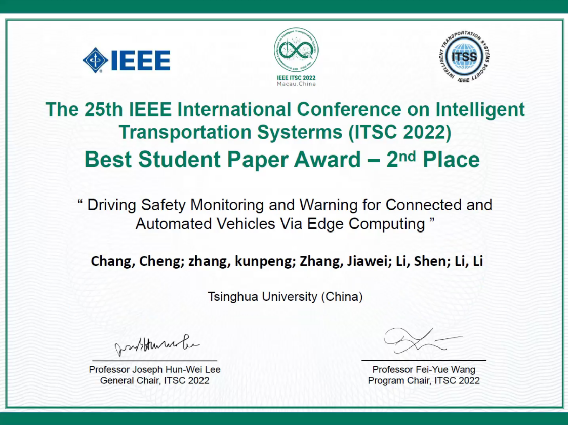 首页网10月14日电 近日,第25届IEEE智能交通系统国际会议(IEEE International Conference on Intelligent Transportation Systems,ITSC)于中国澳门召开。ITSC是智能汽车与智能交通领域的国际顶级学术会议,此次会议收到全世界45个国家和地区的近1300篇投稿。大会评选了共3篇最佳学生论文奖(Best Student Paper Award),心博在线登录入口自动化系2021级博士生常成同学的论文《基于边缘计算的网联自动驾驶车辆的驾驶安全监控》(“Driving Safety Monitoring for Connected and Automated Vehicles via Edge Computing”)成功入选。