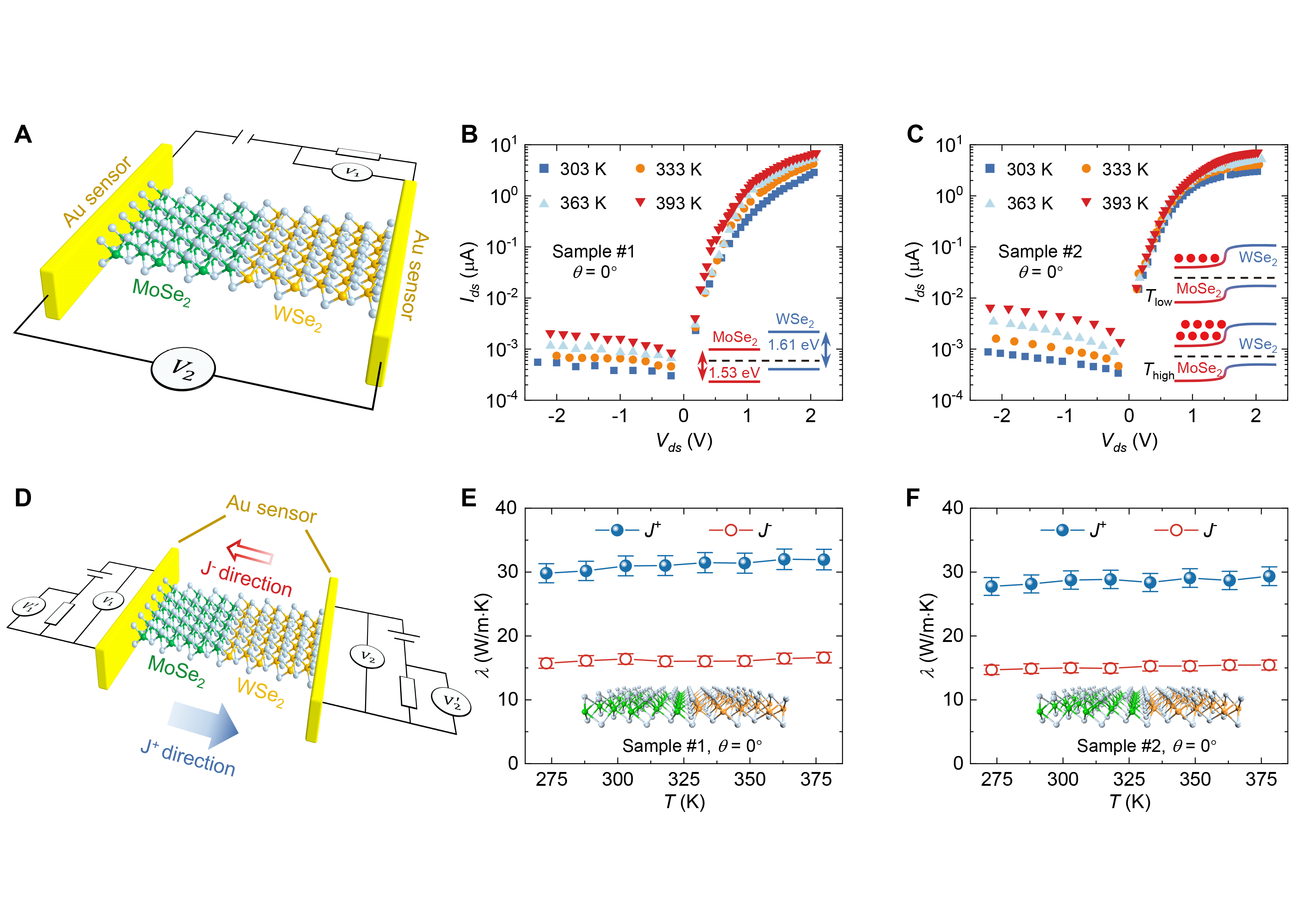 图2.MoSe2-WSe2异质结器件的电整流和热整流特性测量