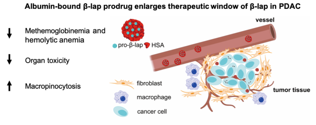 基于胰腺癌自身展现的这种生物学特征,团队设计了一种白蛋白结合型的的β-lap前药,通过皮下移植的KPC小鼠模型充分开展了药效分析及药物安全性评估,实现了PDAC靶向递送并扩大β-lap的治疗窗口,为β-lap在胰腺癌的治疗提供了一种具有转化可行性的药物递送策略。