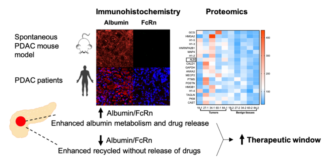 在本研究中,作者通过分析胰腺癌模型小鼠主要器官(心、肝、脾,肺、肾,正常胰腺,癌前病变组织,肿瘤组织)中白蛋白和FcRn的表达情况,发现肿瘤部位具有明显的白蛋白富集,同时FcRn表达水平显著降低,由此可见,白蛋白成为靶向胰腺癌肿瘤部位的理想递送系统。对五名胰腺癌患者的组织样本进行的定量蛋白质组学和免疫荧光分析进一步证实了,相比癌旁正常胰腺组织,肿瘤部位具有升高的白蛋白/FcRn比率。