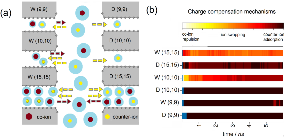 模拟结果显示,电极充电后在W(9,9)的CNT中心出现了D(9,9)中所没有的水链;所有的CNT中水分子都形成了环状结构,其中(15,15)的CNT中存在多个共中心水环。对电极的电荷补偿机制的分析(图1a)表明,D(9,9)和D(10,10)的CNT中仅存在反离子吸附的过程,而对应手性指数的亲水CNT中则同时存在反离子吸附、共离子排斥和离子交换三种机制。这是因为在充电前,亲水的CNT孔中含有更多的水分子和电解质离子,在通电后孔中存在的这些共离子会被排斥出电极孔外。而在更大的(15,15)电极孔中,则无论CNT的亲疏水性如何都同时存在上述三种电荷补偿机制,但是通过充电前6ns电极孔中离子动态的示意图(图1b)可以看出,亲水的(15,15)孔中明显有着远比疏水(15,15)孔中更多的共离子排斥和离子交换。