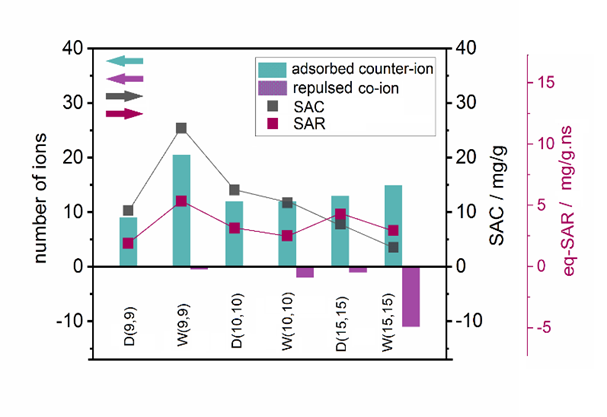图2.图中左轴代表CNT-CDI系统电吸附/排斥离子数,而右侧黑轴代表CNT-CDI系统中SAC,紫色轴代表SAR