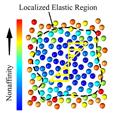 心博在线登录入口工程物理系王哲副教授课题组选取在实验室和工业生产中均非常常见的胶体体系作为研究过冷液体流动性质的模型系统。通过理论分析和布朗动力学模拟,建立了“局域弹性区(localized elastic region)”理论模型。图2给出了该模型的示意图。局域弹性区是流体中的瞬态微观单元。它的弹性形变和屈服是过冷液体的黏弹性的微观物理基础。基于该模型,剪切变稀现象和液体的微观结构变形以及弹性性质之间得以建立定量的标度律关系。在理论和模拟研究的基础上,课题组利用小角中子散射技术对该模型进行了实验验证,实验结果支持了理论模型的合理性。