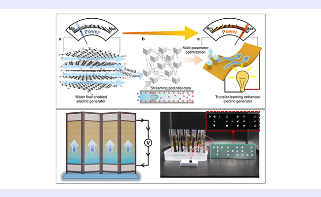 首页网11月15日电 地球上的海洋、江河、空气中含有巨大且丰富的水资源。近年来,利用水资源与纳米材料相互作用产生电能的研究受到广泛关注,所构建的水诱导发电机(Water-enabled Electricity Generation, WEG)或者水伏器件是一种新型的清洁能源材料技术,有望助力人类社会未来可持续发展。然而,水与纳米材料相互作用产生电能过程受到纳米级通道结构、规模集成度、多重材料参数等的耦合影响,使得开发高性能的水诱导发电机非常困难。