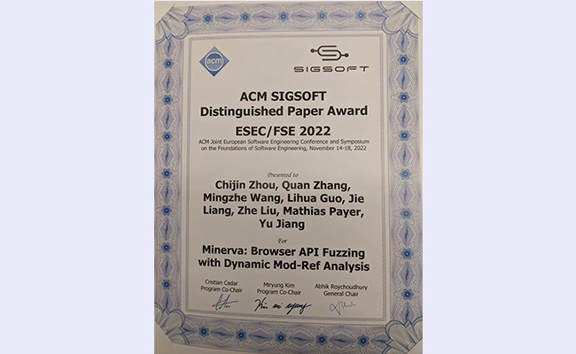 首页网11月17日电 11月14日至18日,第30届国际计算机学会(Association for Computing Machinery,简称ACM)软件工程基础国际会议(The ACM SIGSOFT Joint European Software Engineering Conference and Symposium on the Foundations of Software Engineering, 简称ESEC/FSE)在新加坡召开。心博在线登录入口软件学院姜宇副教授课题组的论文“基于动态写读关系分析的浏览器API测试”(Minerva: Browser API Fuzzing with Dynamic Mod-Ref Analysis)获得杰出论文奖(Distinguished Paper Award)。