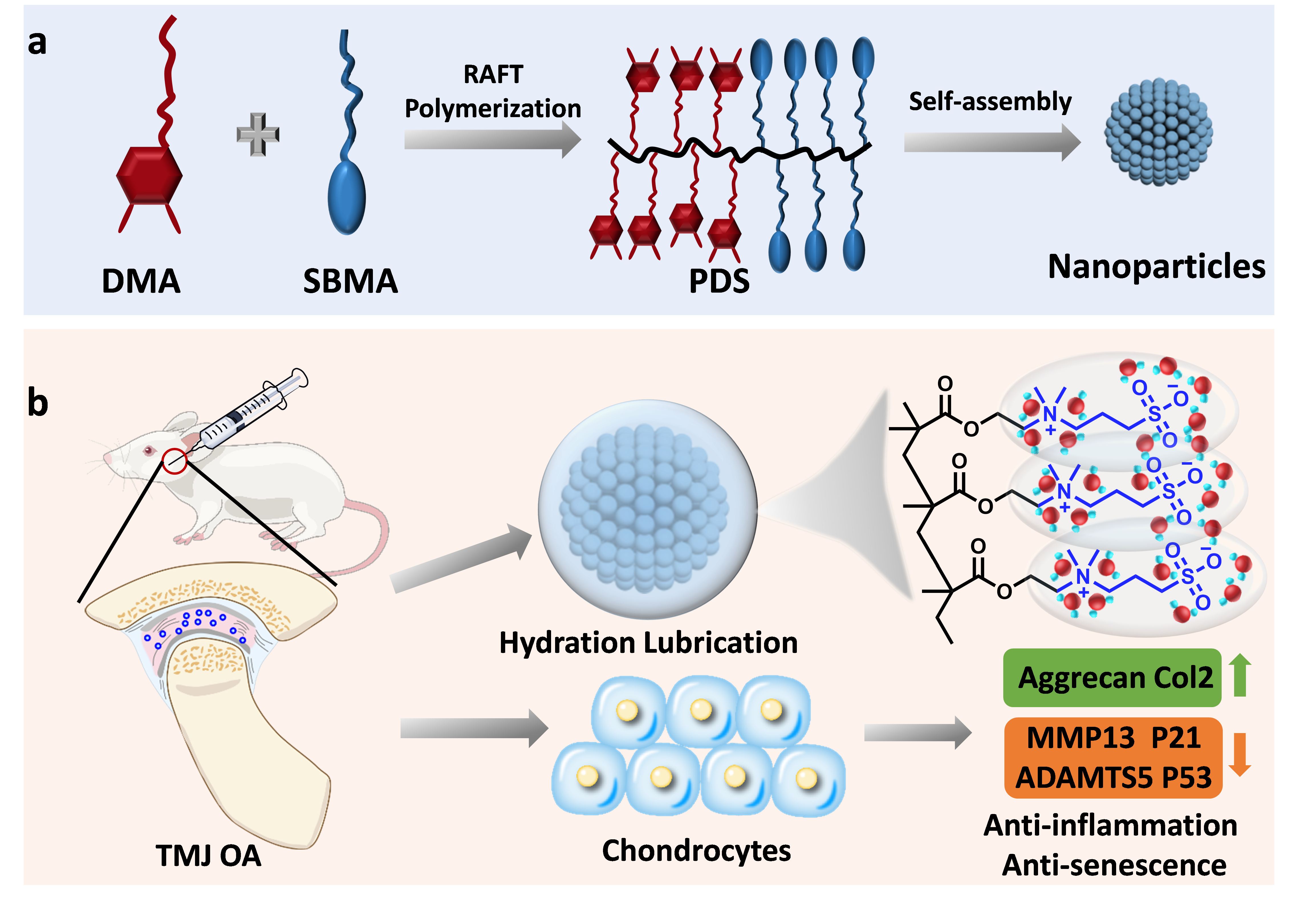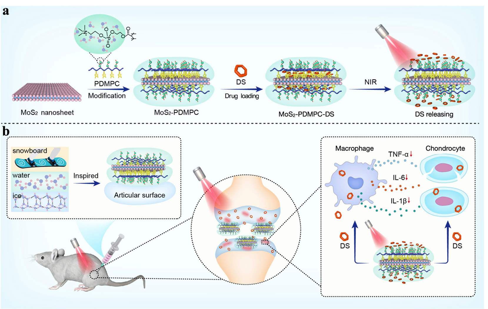 首页网11月18日电 骨关节炎是一种由软骨磨损引发的骨关节疾病,可影响人体髋关节、膝关节以及颞下颌关节等多个关节,其发病机制与关节润滑功能丧失和机械过载相关。机械过载可导致炎症因子和分解代谢酶表达升高,诱导软骨细胞自噬和凋亡,从而使退化的关节软骨表界面摩擦增大,进一步加剧关节炎症,形成恶性循环。传统的关节腔局部注射药物方式存在功能单一、药物效率低等局限性,而短期内频繁给药会带来诸多不便。