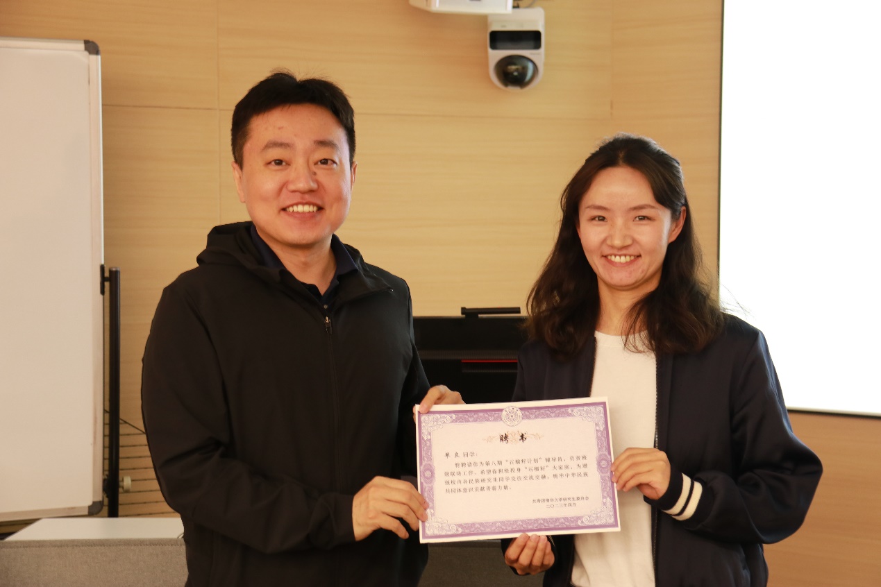 党委研究生工作部综合办主任王竟达为第八期“石榴籽计划”班级辅导员、公管学院2018级博士生单良颁发辅导员聘书。