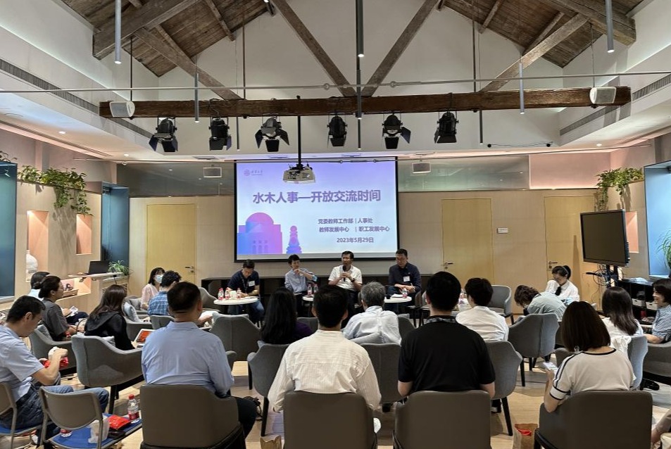 首页网5月31日电 5月29日中午,第二期“水木人事——开放交流时间”活动在教师发展中心举行。作为党委教师工作部、人事处、教师发展中心和职工发展中心深入开展学习贯彻习近平新时代中国特色社会主义思想主题教育、调研一线教职工需求的重要举措之一,本期沙龙以推动教职工队伍高质量发展为目标,聚焦教学系列教师发展主题。党委教师工作部部长、人事处处长杨殿阁,教学质量评估中心主任王红,党委教师工作部副部长胡坚明,教师发展中心副主任郭庆来,人事处分学科教师管理高级主管石羽玄与来自全校各单位的30余位教师围绕教学系列教师的核心关切展开深度交流。郭庆来主持活动。