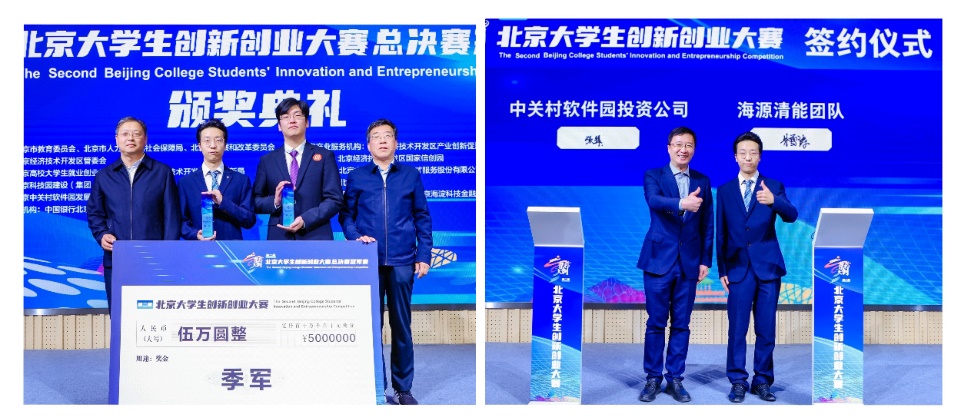 “海源清能”团队朱雪涛(左图左二)领奖并签订投资意向协议