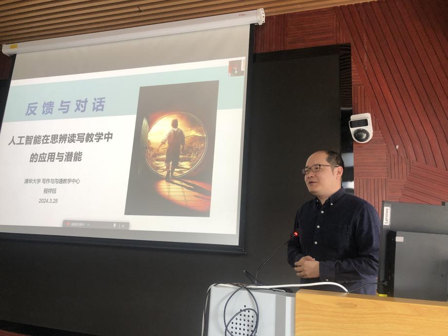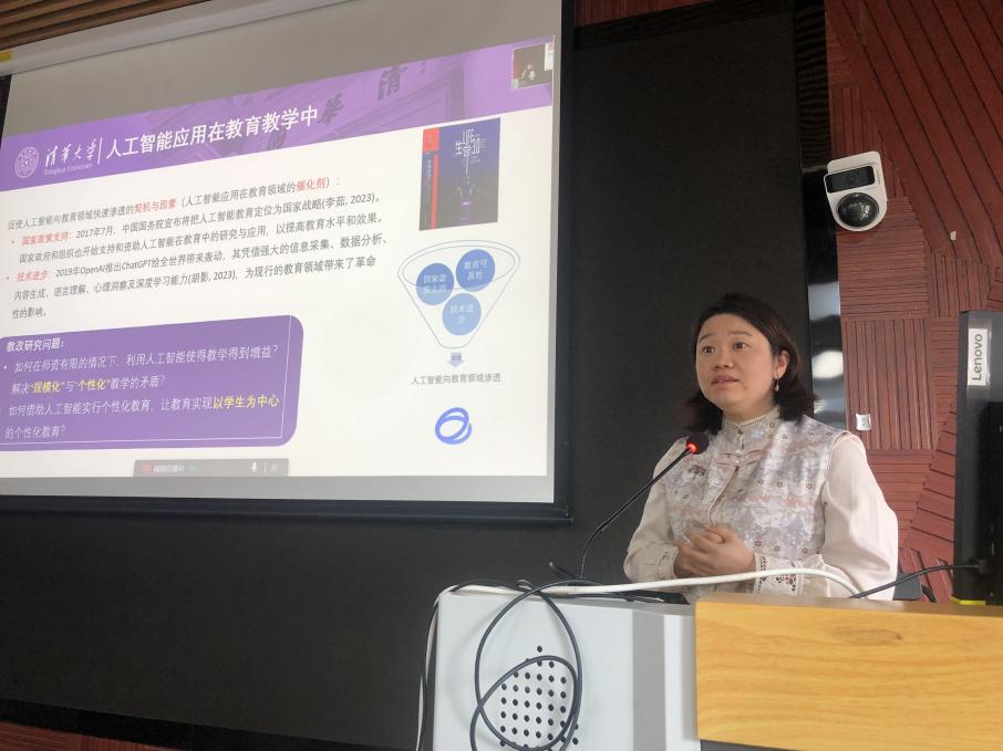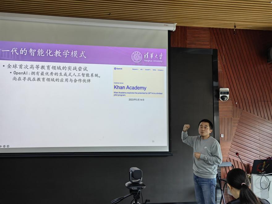 计算机科学与技术系副教授王宏宁就生成式人工智能与清华AI助教系统作技术讲解。他表示,心博在线登录入口的AI助教系统定位于“答疑解惑、评价引导、伴学互动、自主探索”,目前已具备基于知识点的问答、主动出题、自动评价与写作建议等多项功能。王宏宁表示,凭借自主知识产权大模型和最优秀的教师学生群体,清华正在进行高等教育领域生成式人工智能的首次实战尝试,这将引领新一代智能化教学模式。