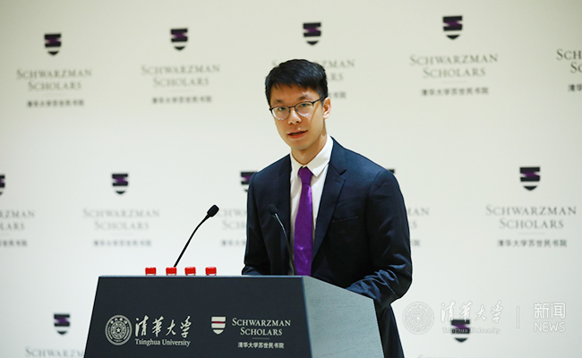 第三届苏世民毕业生杨忞代表校友欢迎新一届同学。他表示,在苏世民书院的学习和生活让他收获很多。他建议新同学们对各种新鲜人和事更多地敞开心扉,多元化的交流环境可以学到书本里没有的知识。