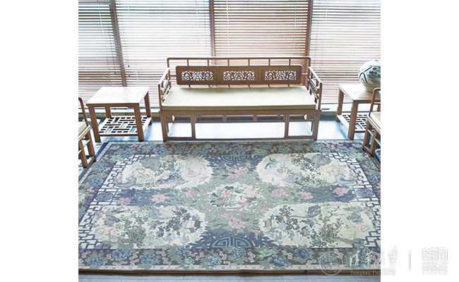 张灿的地毯图案设计作品《静林》以手绘的方式完成。画面以青绿为基调,山川俊秀、松林静谧,蕴含着游园林中的清新之气、自然之气。以含蓄的色彩、清雅的风格传递出寄托山水的古韵情怀。
