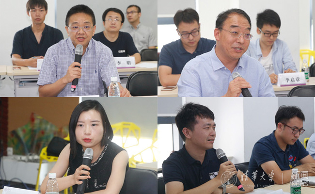 教务长彭刚(右上)主持会议,双创培育机构代表李双寿(左上)、创投企业代表余彬燕(左下)、学生初创企业创始人代表王世栋(右下)在座谈会上发言。 常志东 摄