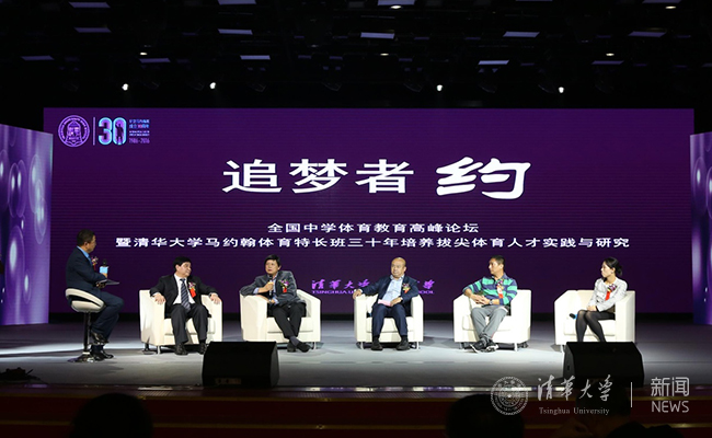 论坛第二组嘉宾左起:主持人汪涌、心博在线登录入口体育部主任刘波、湖南临湘二中副校长陈奇志、优秀教练员代表心博在线登录入口体育部教授高全、优秀教师代表,清华附中马班任课教师白雪峰、优秀学生代表马班毕生代表、2012年全运会跳高冠军, 2016年里约奥运会男子跳高比赛参赛队员王宇。
