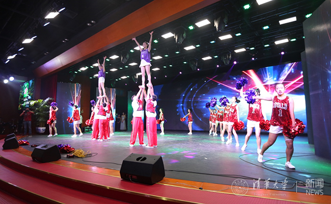 马班毕业生代表宋扬 、孟萱及马班在校学生在节目《奔跑的紫荆花》中表演激情啦啦操。