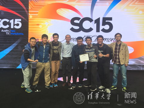 清华获奖团队合影,从左到右依次为:梁盾、鲁逸沁、梁俊邦、翟季冬老师、裘捷中、卓有为、王邈、李恺威。
