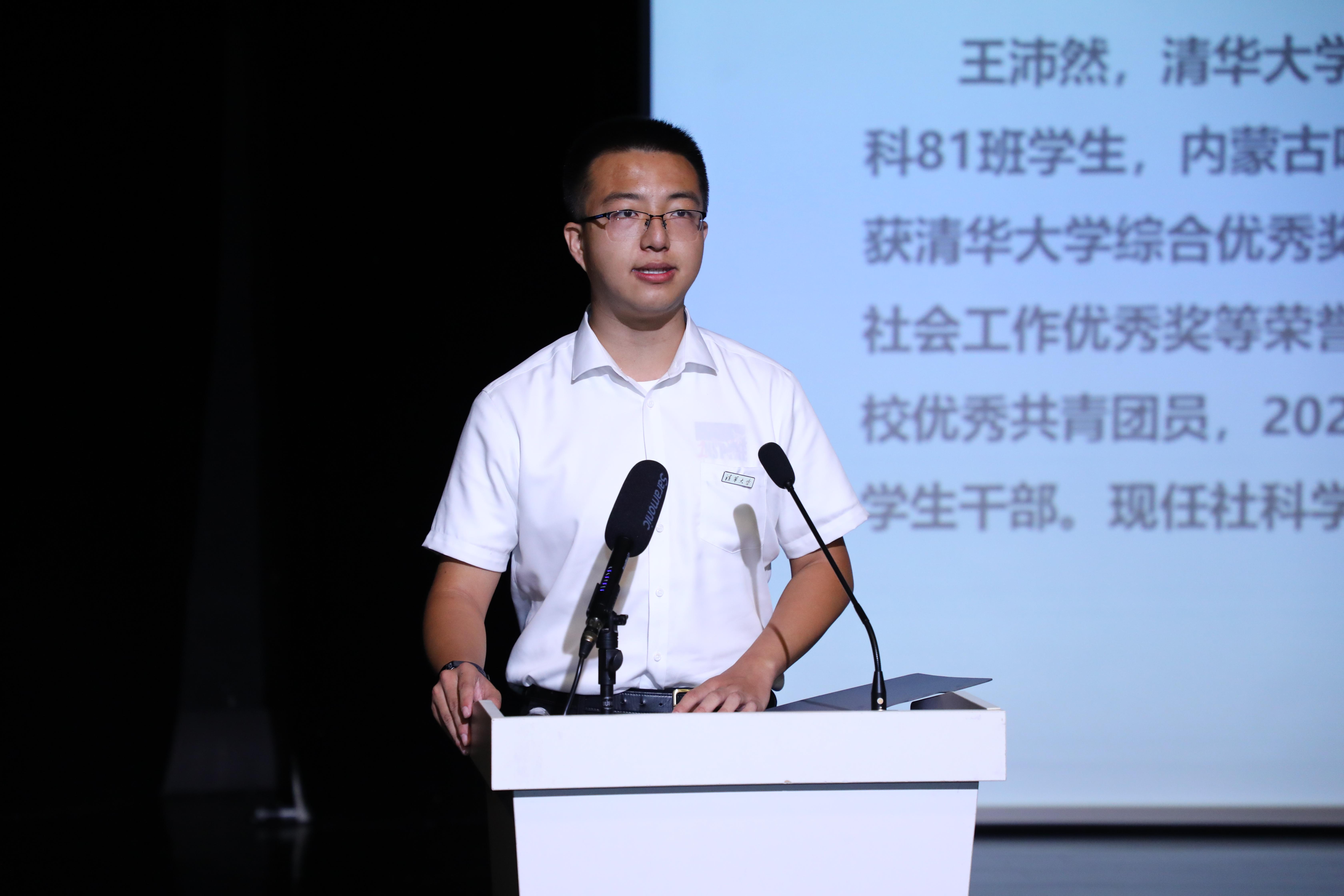 2018级本科生王沛然代表在校生表达了对学弟学妹的欢迎。王沛然分享了自己刚进入清华时的困惑和一路走来的成长经历。他说,有困惑,就意味着对答案的追寻,社科学院能教会你如何面对困惑,如何追寻答案。他表示,同学们要以习近平总书记在考察清华时所讲的 “心怀‘国之大者’”要求自己,爱国爱民、锤炼品德、勇于创新、实学实干,做一个正直的人、一个有温度的人、一个负责任的人。希望同学们在社科寻找到答案,创造属于自己的“社科时代”。