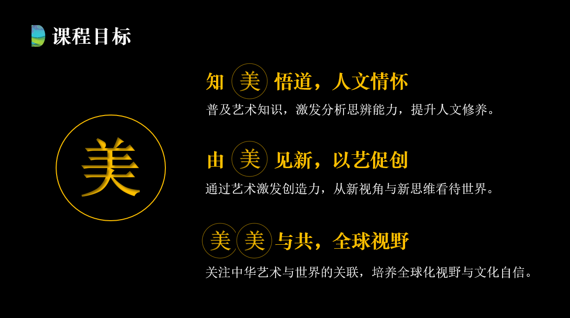 “艺术原理”课程通过艺术史论学习与艺术鉴赏,帮助学生把握艺术规律,提升人文素质,实现“知美悟道”;通过艺术激发学生的创造力,从新视角与新思维看待世界,实现“由美见新”,帮助学生拓展全球文化视野,增强文化自信,实现“美美与共”。