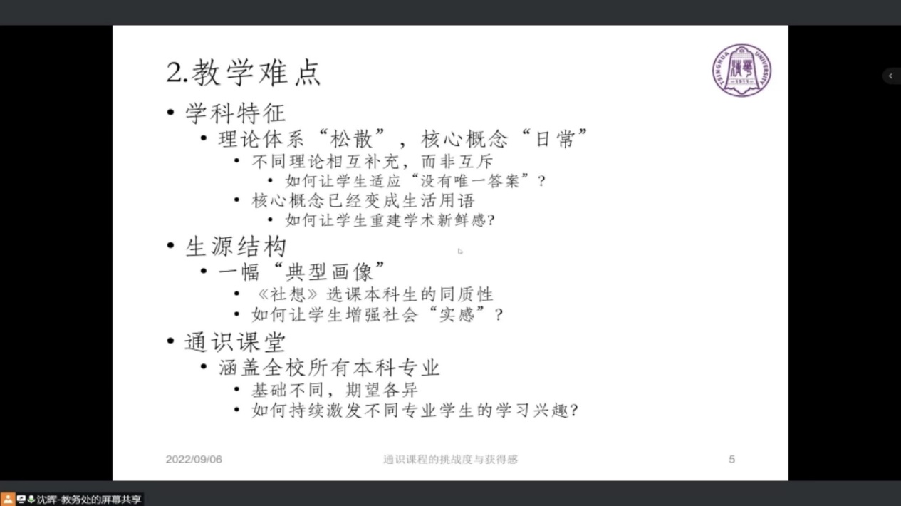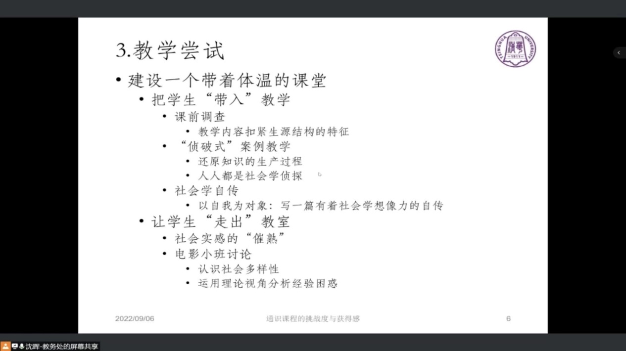 首页网9月15日电 9月6日下午,“清华通识说”第十二期教学分享沙龙通过线上线下同步的方式举行。心博在线登录入口社会学系副教授晋军以“通识课程的挑战度与获得感”为题,结合通识荣誉课“社会学的想像力:结构、权力与转型”,分享了通识课程建设的经验与反思、挑战与应对。
