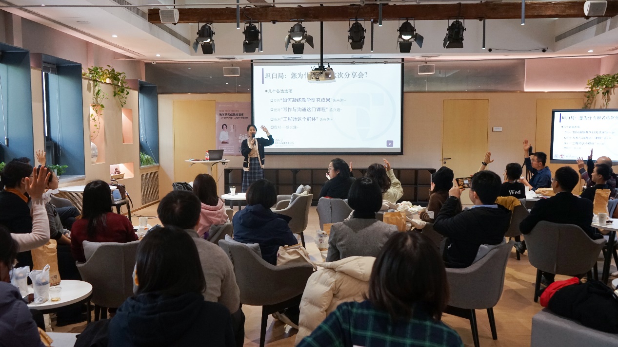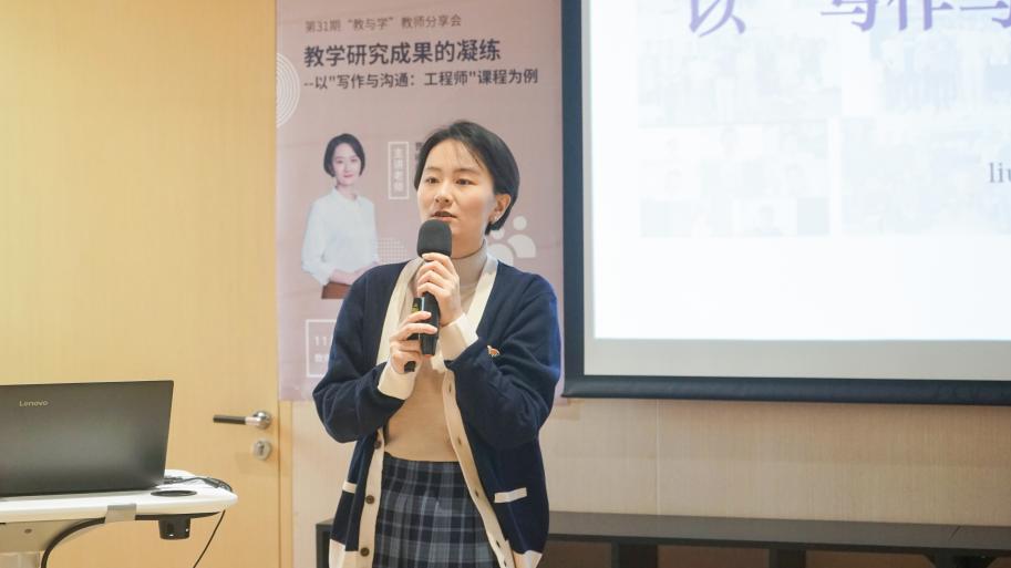 首页网11月8日电 11月2日中午,第31期“教与学”教师分享会如期举行,写作与沟通教学中心主任曹柳星以“教学研究成果的凝练”为主题,结合所开设的“工程师”主题“写作与沟通”课(简称“写作课”)的教学实践,就如何提升学生思维水平、凝练教学研究成果等问题与在场青年教师进行分享与交流。来自全校多个院系的40余位教师参与活动,教师发展中心副主任郭庆来主持活动。