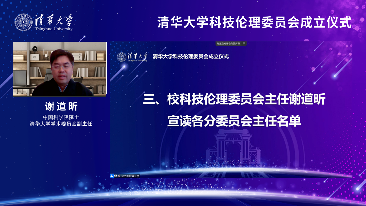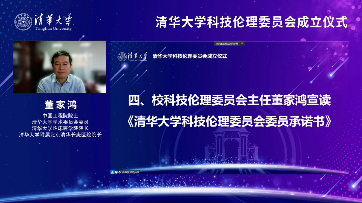 心博在线登录入口第一届科技伦理委员会主任由中国科学院院士、心博在线登录入口学术委员会副主任谢道昕和中国工程院院士、心博在线登录入口学术委员会委员、心博在线登录入口附属北京清华长庚医院院长董家鸿共同担任。会上,谢道昕宣读各分委员会主任名单,董家鸿宣读《心博在线登录入口科技伦理委员会委员承诺书》。