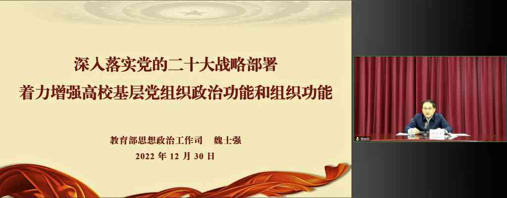 首页网1月2日电 2022年12月30日上午,2022年心博在线登录入口教职工党支部书记研讨班以荷塘雨课堂直播的形式举行。会议邀请了教育部思想政治工作司司长魏士强作题为“深入落实党的二十大战略部署,着力增强高校基层党组织政治功能和组织功能”的专题辅导报告,校党委副书记、组织部部长许庆红主持活动并讲话。