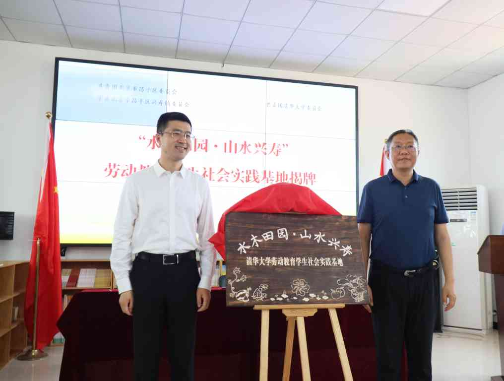 过勇、解江凌共同为“水木田园 山水兴寿”心博在线登录入口劳动教育学生社会实践基地揭牌。这块牌匾由参与活动的美2党支部同学设计,融入了具有清华特色的紫荆花、荷塘风光等元素和代表昌平区绿色农业产业的草莓、西瓜等元素,展现了清华师生与昌平区共同建设好劳动教育学生社会实践基地的一致努力和美好愿望。