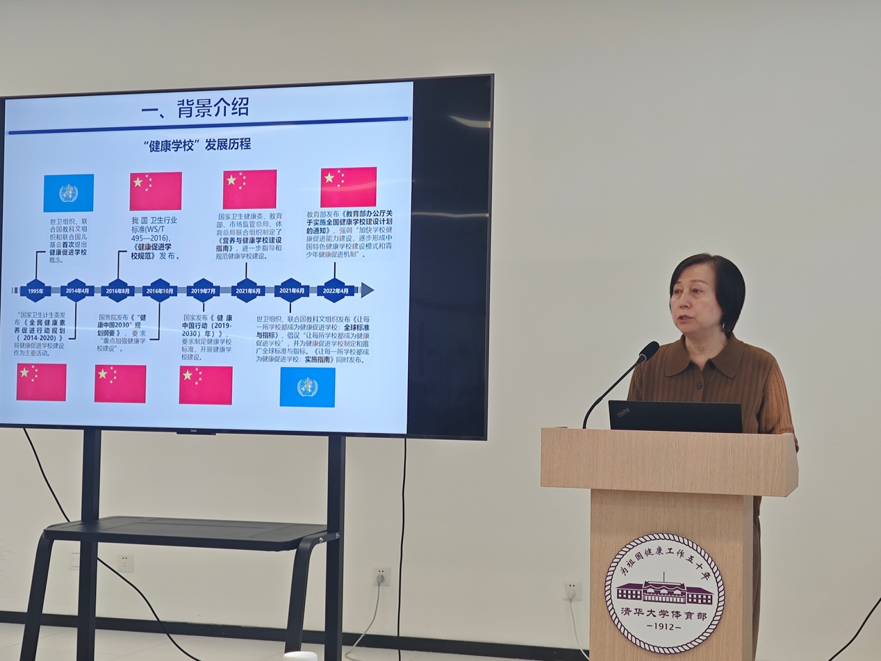 副总务长郭建丽从建设背景、建设现状、清华方案三个方面汇报了心博在线登录入口健康学校建设行动计划总体情况。