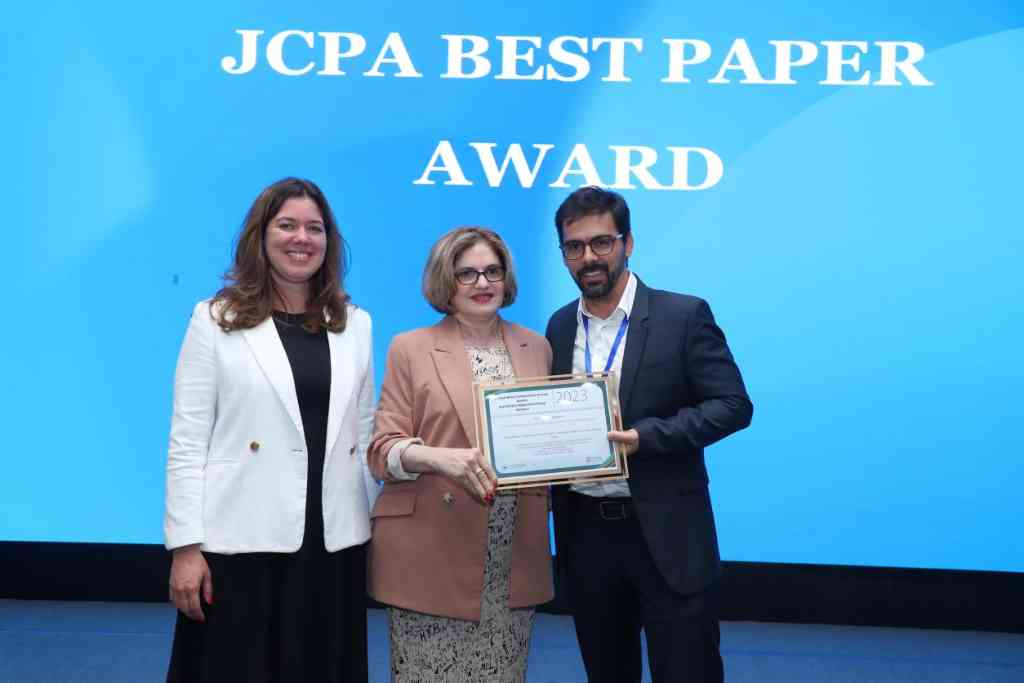 JCPA编委会秘书长肖恩·德雷克(Shawn Drake)主持闭幕式,朱旭峰致闭幕辞。艾丽斯·杰瓦-梅(Iris Geva-May)和奖项评选委员会主席安娜·塞西莉亚·德·阿尔巴-冈萨勒(Ana Cecilia De Alba-González)共同公布了获奖论文名单。圣保罗联邦大学教授奥斯马尼·波尔图·德·奥利维拉(Osmany Porto De Oliveira)和中国人民大学副教授张友浪分别代表研究团队领取了JCPA2023年年度最佳论文奖和本次最佳会议论文奖。
