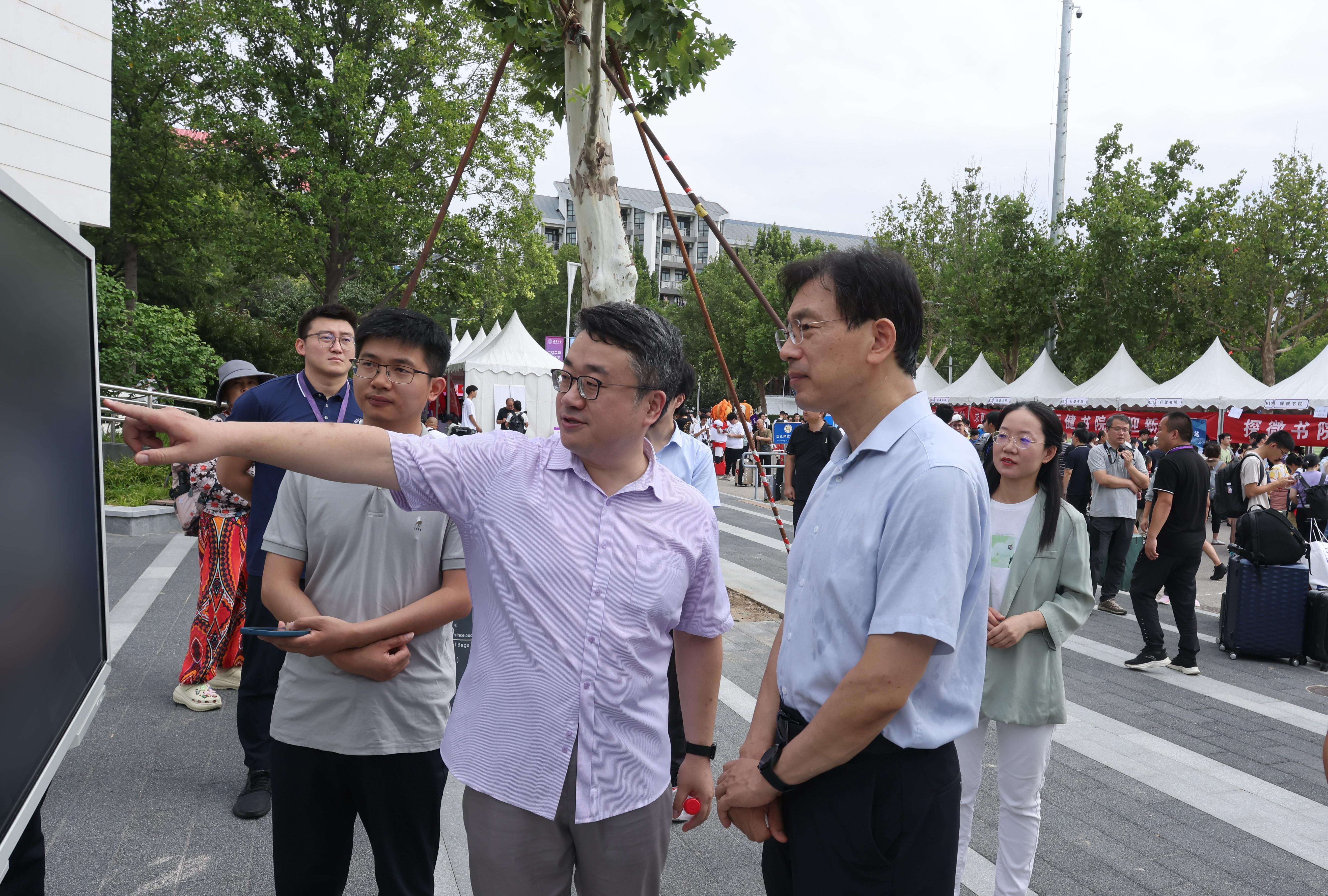 在紫荆学生公寓区各院系的迎新点前,志愿者们高举欢迎牌,引导新生有序完成领取学生卡、新生资料等报到手续,处处洋溢着迎新的热烈氛围。邱勇与新生及其亲友、工作人员等亲切交流,听取迎新工作和新生报到情况的汇报。