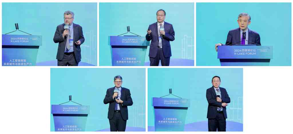 主旨演讲环节(从左至右、从上至下:埃菲·杰曼诺夫、张锦、薛澜、约阿希姆·霍内格尔、倪明选)