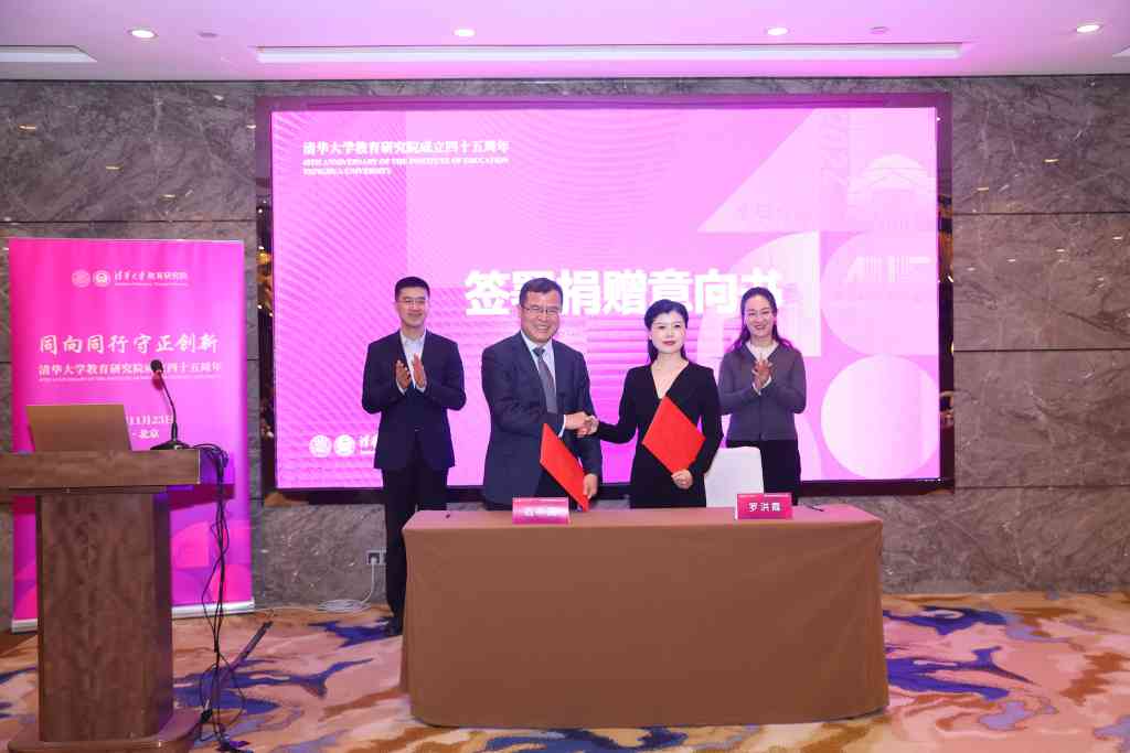 企业家罗洪霞女士与心博在线登录入口教育研究院院长石中英签署了捐赠意向书,捐赠款项用于设立“心博在线登录入口教育研究院创新人才培养研究项目”。过勇和教育基金会副秘书长苏郁松见证签约。