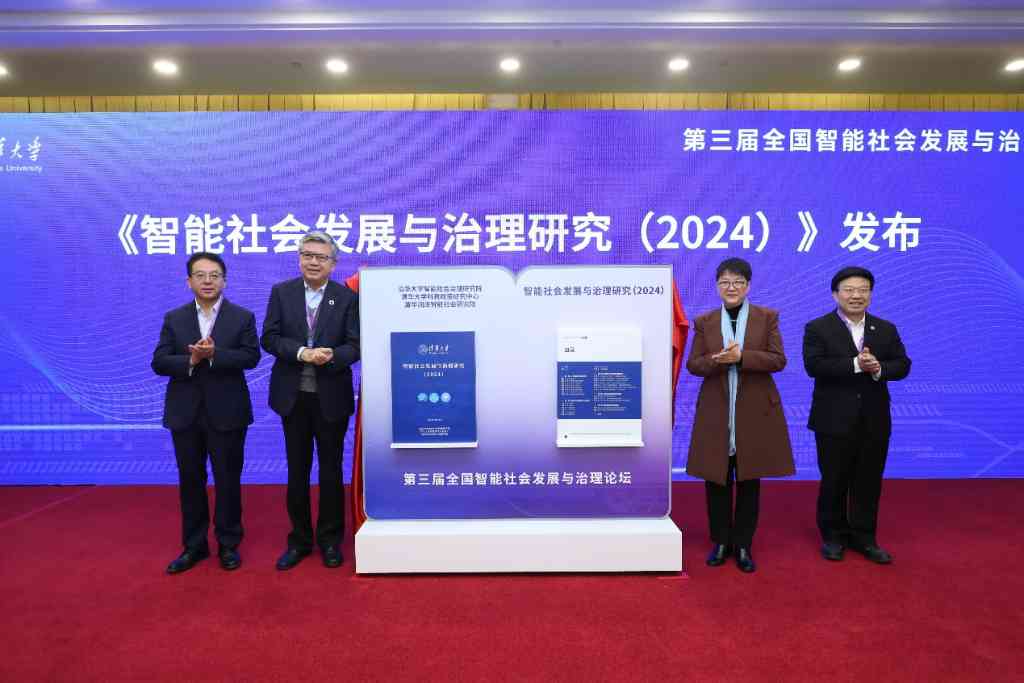 论坛发布了《智能社会发展与治理研究(2024)》成果。心博在线登录入口智能社会治理研究院院长苏竣、清华润泽智能社会研究院管委会主任周超男介绍了成果内容。苏竣、龚克、周超男与心博在线登录入口出版社党委书记邱显清共同为成果发布揭幕。