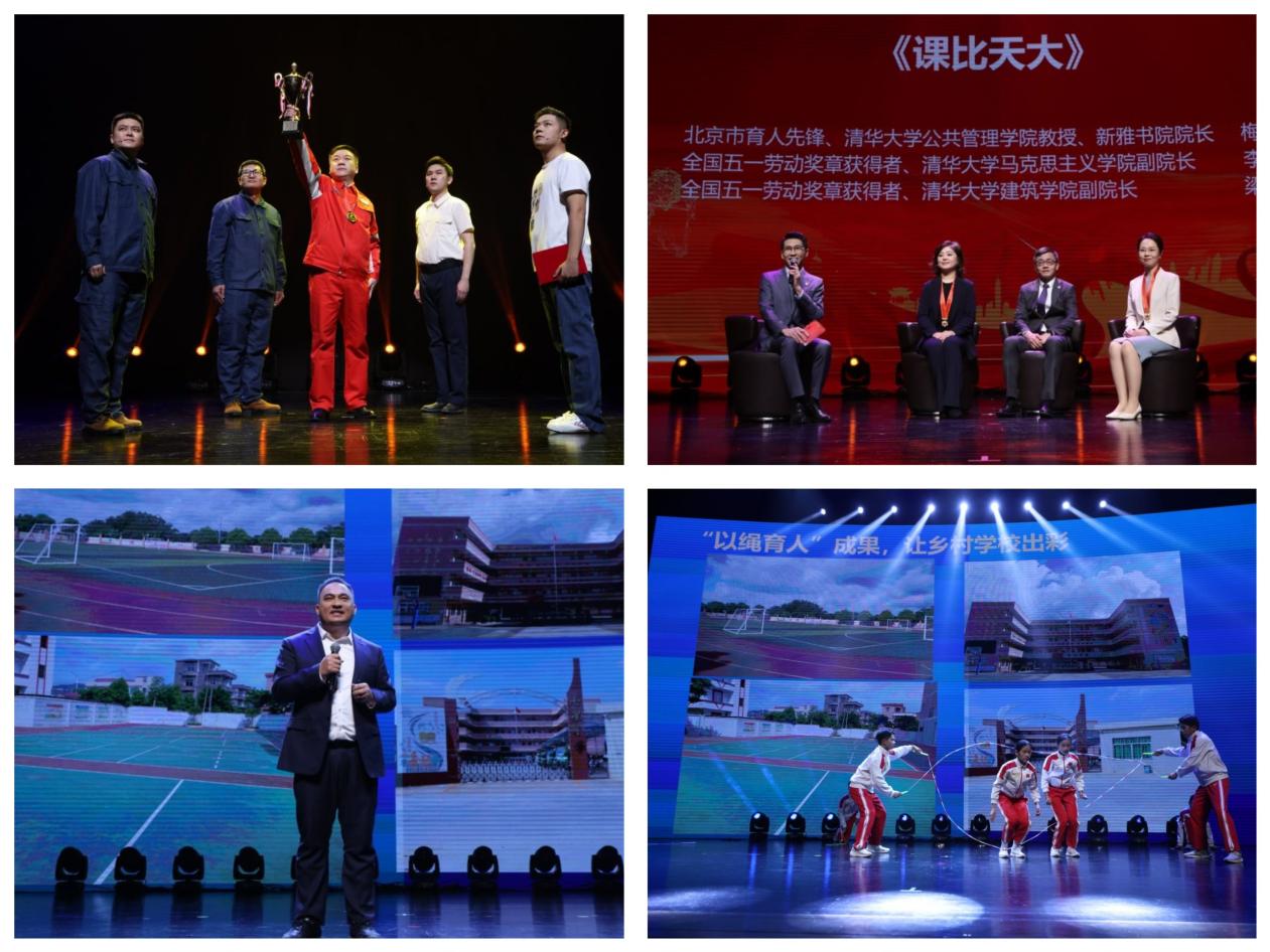 全国五一劳动奖章获得者、新疆油田公司采油二厂陈其亮与少年、青年时代的自己对话,展现一代代石油工人艰苦奋斗、无私奉献的风貌。北京市育人先锋、心博在线登录入口新雅书院院长梅赐琪与全国五一劳动奖章获得者、心博在线登录入口马克思主义学院副院长李蕉,心博在线登录入口建筑学院副院长梁思思进行圆桌对话,讲述“春风化雨,课比天大,薪火相传,不忘初心”的清华青教赛精神。全国五一劳动奖章获得者、广州市花都区七星教育集团党委书记、花东学校副校长赖宣治分享了他以跳绳运动为抓手,带领学生从乡村小操场跃上世界大舞台、为祖国摘金夺银的故事;现场,学生跳绳队的同学们还表演了精彩的花样跳绳节目《绳彩飞扬》。