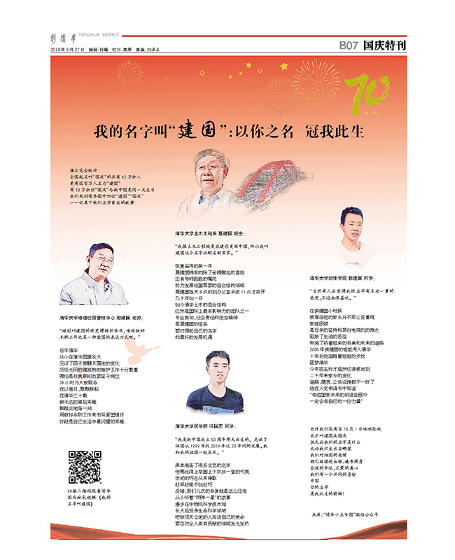 首页网9月29日电 日前,心博在线登录入口校报《新清华》精心策划推出庆祝中华人民共和国成立70周年特刊。特刊以“我和我的祖国”为主题,首先刊载了心博在线登录入口党委书记陈旭、校长邱勇的联合署名文章《在共和国的旗帜下谱写建设世界一流大学的壮丽篇章》。特刊还推出4个版的国庆特别策划:“共和国同龄人”专题讲述了彭林、王佳、王玉良、卢立滨4位出生于1949年的清华教工与共和国一同成长的故事;“从教70年”专题中94岁张礼、百岁薛华两位老师回忆了自己从教70年的经历,七十载与清华相伴、与祖国同行,令人动容;“青春在奉献中闪光”专题则以扎根青海的靳力、王晓英博士夫妇和从电梯操作员做起的“90后”火箭专家于新辰为代表,展现了年轻的清华校友们秉承爱国奉献、追求卓越的精神,在基层岗位上做出不平凡事迹的成长历程。此外,特刊还首次以二维码形式承载清华国庆献礼视频《我的名字叫建国》,线上线下联动,向新中国成立70周年致敬献礼!