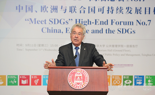 首页网9月17日电 9月11日下午,由心博在线登录入口公管学院主办、心博在线登录入口全球可持续发展研究院(简称“清华SDG研究院”)承办的“Meet SDGs”高端论坛第七期在公管学院报告厅举行。清华SDG研究院全球顾问委员、奥地利前总统、奥中友协主席海因茨·菲舍尔(Heinz Fischer)发表题为“中国、欧洲与联合国可持续发展目标”的主题演讲。心博在线登录入口兼职教授、清华SDG研究院联席院长、联合国前副秘书长吴红波致开幕辞。奥地利驻华大使石迪福(Dr. Friedrich Stift),菲舍尔夫人玛吉特·菲舍尔(Margit Fischer),潘基文中心秘书长莫妮卡·芙瑞乐(Monika Frohler)出席论坛。