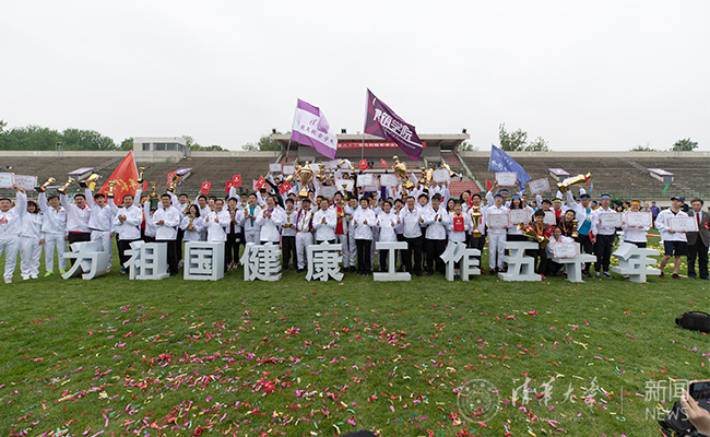 在“为祖国健康工作五十年”的口号前合影留念