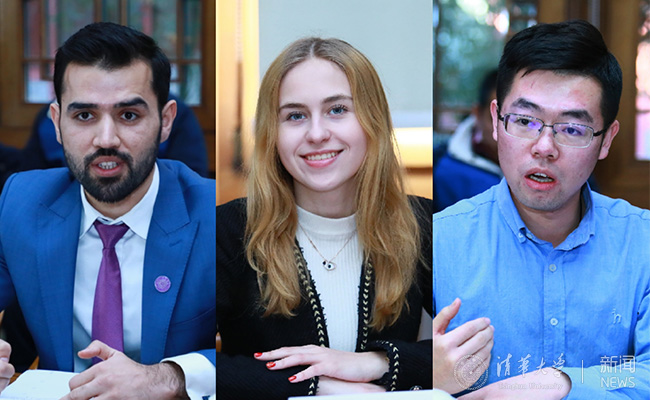 美国籍社科学院本科生宋垣莹、硕士生太乐,俄罗斯籍中文系硕士生罗维卫,阿富汗籍社科学院博士生沙明,白罗斯籍人文社会类本科生苏小小,校研究生会主席王展硕先后作交流发言,分享各自在清华的学习生活体验。