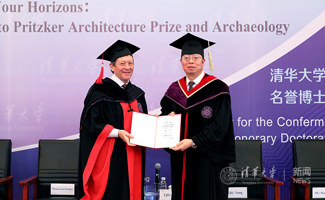在授予仪式上,邱勇对普利兹克获得清华名誉博士学位表示祝贺。他表示,普利兹克先生不仅是商界、文化、国际事务及社会公益领域的杰出领军人物,在建筑领域也备受尊敬并深具影响力。在普利兹克先生的大力支持下,清华于2011年启动了普利兹克-心博在线登录入口建筑英才培训项目,为中国青年建筑学子提供了跟随世界顶尖建筑大师学习和深造的机会。