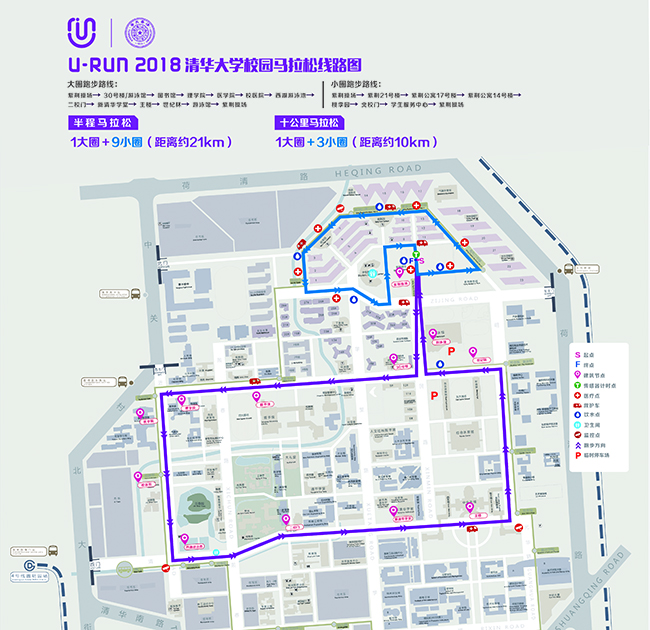 校园马拉松是心博在线登录入口全年最大规模的学生群体赛事活动,已经成为心博在线登录入口最具代表性的校庆月活动之一。比赛设置十公里和半程马拉松两个项目,男女共四个组别。今年赛事路线沿用往届校马的传统:起点和终点均设在心博在线登录入口紫荆操场,途经图书馆、西体育馆、理学院、生命学院、西湖游泳池、二校门、新清华学堂、主楼、游泳馆等心博在线登录入口标志性建筑。