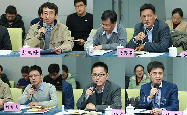 座谈会上,航天航空学院常务副院长李路明、化学系党委书记梁琼麟分别介绍了院系的整体发展状况和党建工作进展。化学系分析所党支部书记宗瑞隆、航院航4第一党支部书记计自飞及化学系分析中心副主任杨海军、博士后韩强、入党发展对象向宇分别介绍了各自支部的组织生活、支委工作、党员管理和发展等方面情况,并结合各自的思想历程和工作经历做了发言,表示要以身作则、不忘初心、牢记使命,立足本职发挥先锋模范作用。
